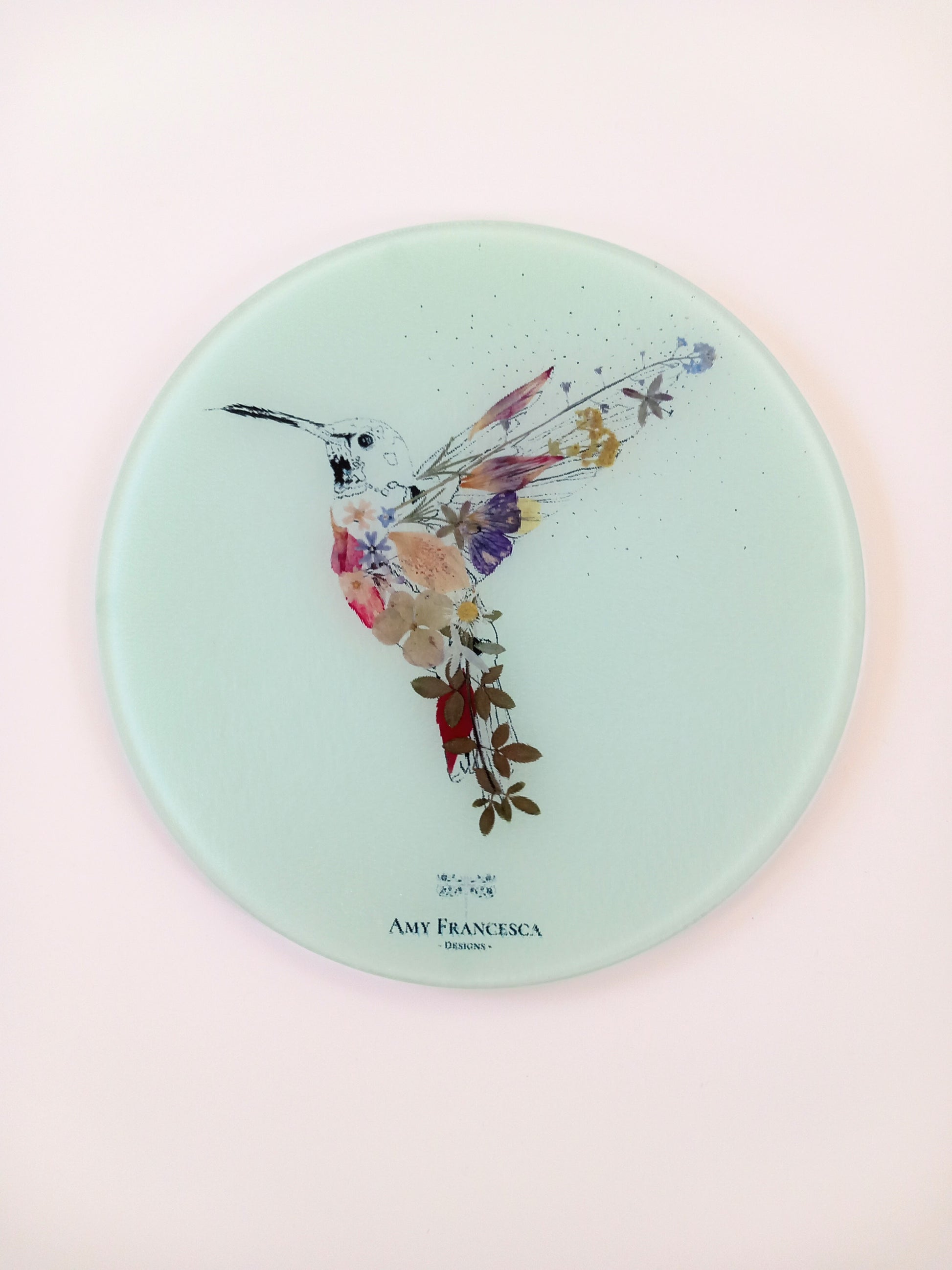 Amy Francesca Designs 'Hummingbird' Glass Chopping Board is available in a circular shape only.